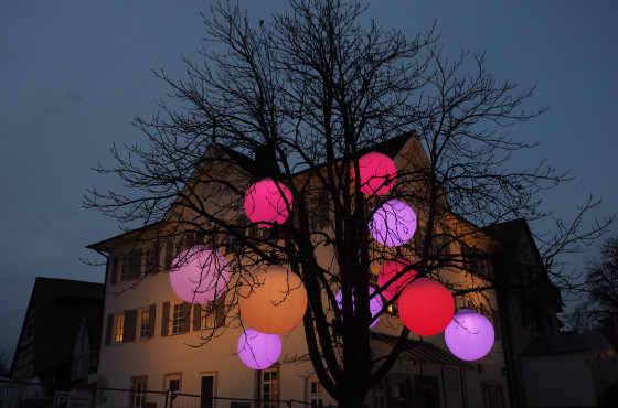 Die Lustnauer Mühle in Tübingen ist ein begehrter Treffpunkt für Liebhaber der italienischen Küche. Auch wir haben unzählige Mittagspausen und Abende dort verbracht und freuen uns, den Baum vor der Mühle mit unseren Kugeln weihnachtlich schmücken zu dürfen. Da die Farbe der Kugeln nach Lust und Laune verändert werden kann, bleiben die Objekte auch beim dritten Besuch ein echter Hingucker!
