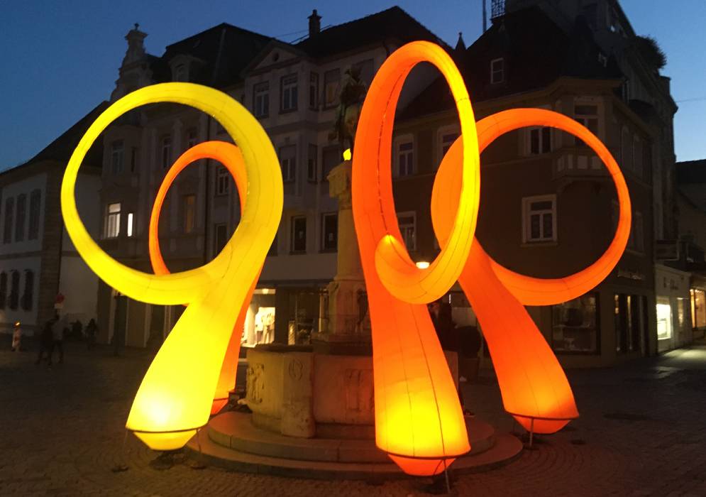 MOND gewährt Durchblicke und umrahmt seinen Hintergrund. Er wird optimal ergänzt durch Projektionen an großen Wänden und weitere seiner Art. Durch den richtigen Winkel entsteht eine tolle Geometrie in großen und langen Straßen, die eine erstaunliche Wirkung erzeugt. Im oberen Teil des Objektes sind ringsherum LEDs angebracht, um die gesamte Fläche trotz Krümmung optimal auszuleuchten.