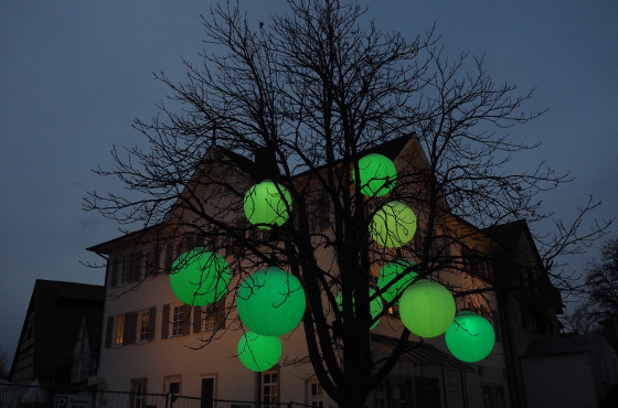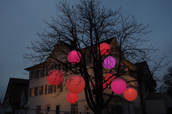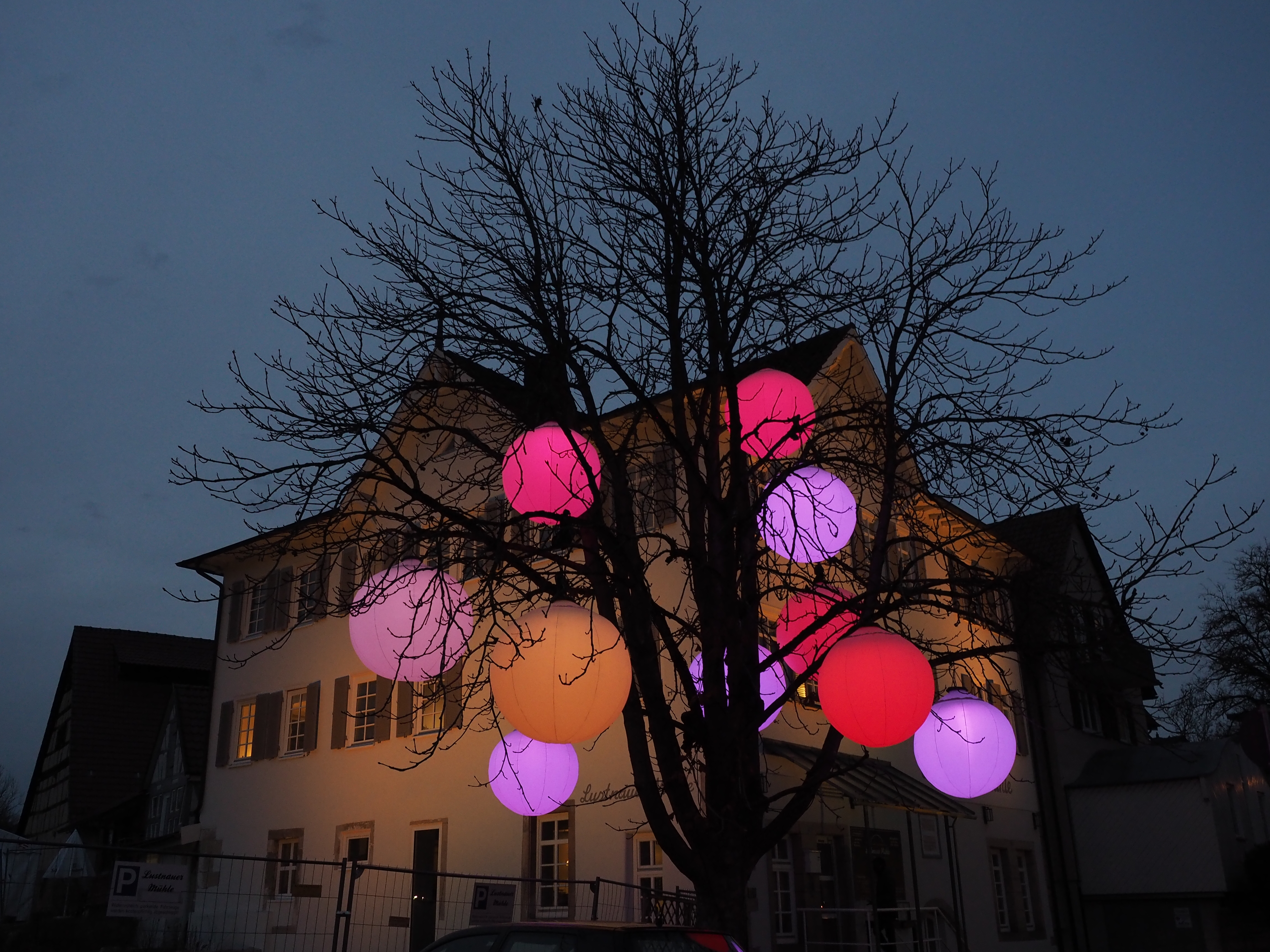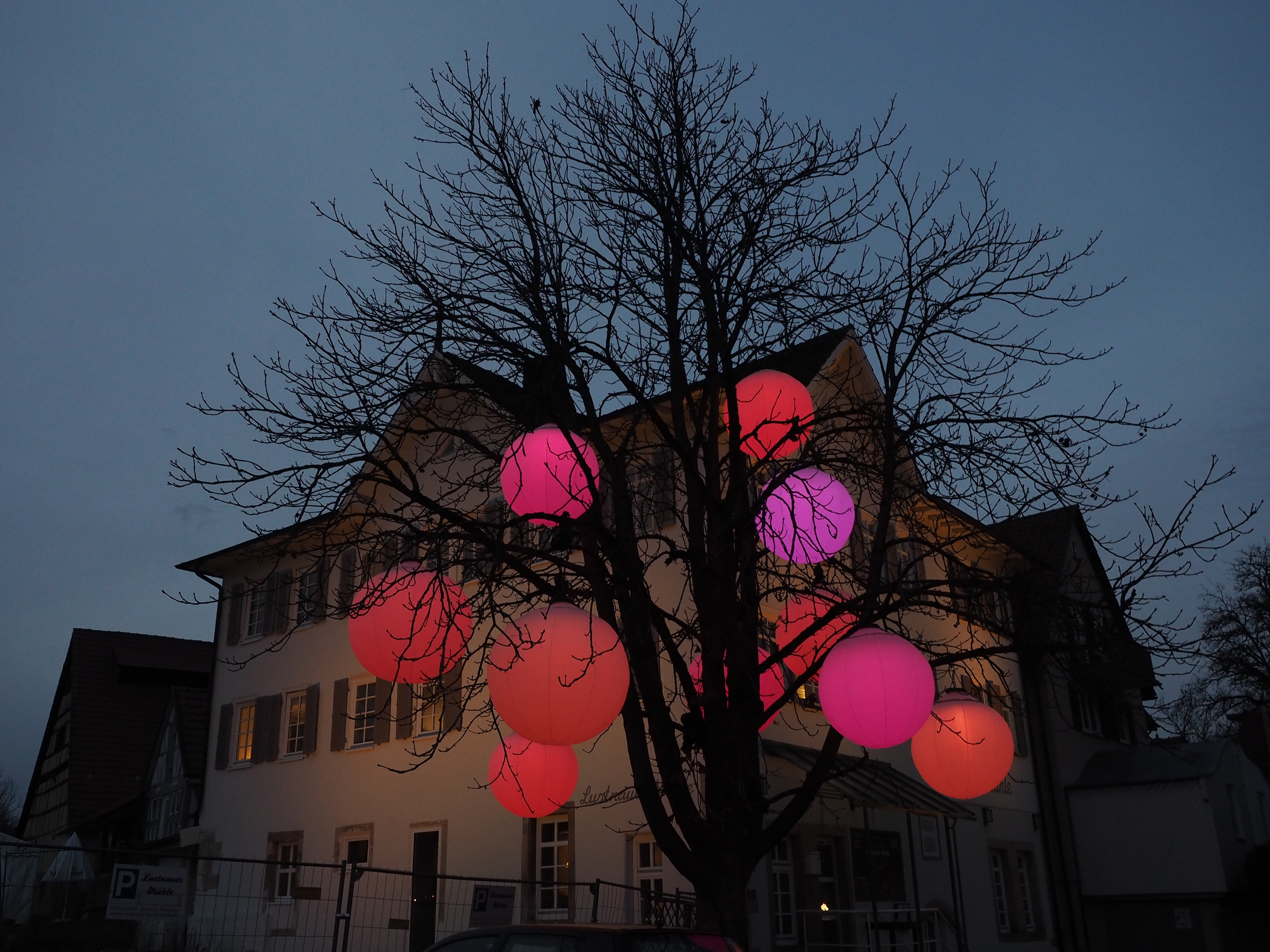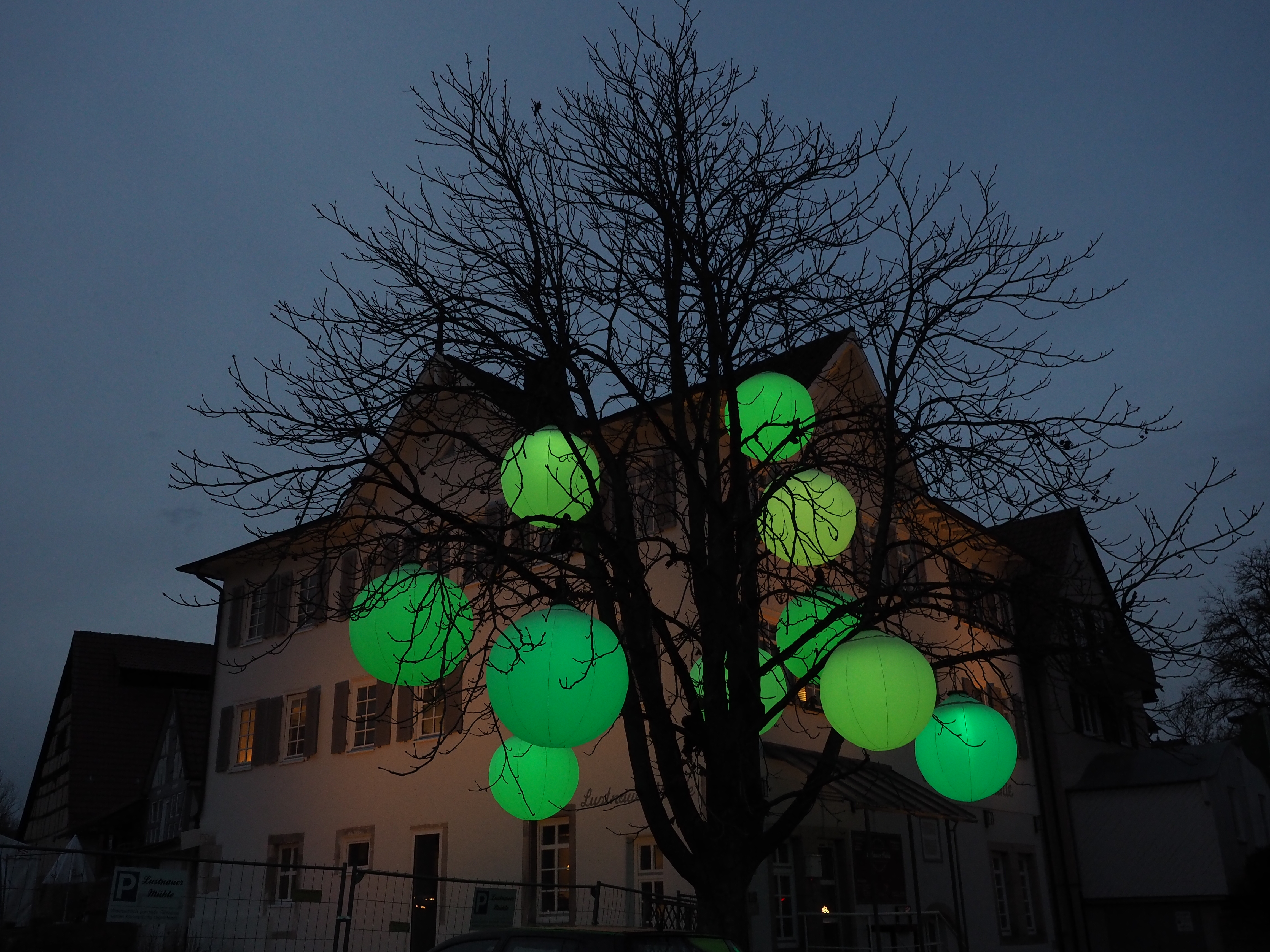 Die Lustnauer Mühle in Tübingen ist ein begehrter Treffpunkt für Liebhaber der italienischen Küche. Auch wir haben unzählige Mittagspausen und Abende dort verbracht und freuen uns, den Baum vor der Mühle mit unseren Kugeln weihnachtlich schmücken zu dürfen. Da die Farbe der Kugeln nach Lust und Laune verändert werden kann, bleiben die Objekte auch beim dritten Besuch ein echter Hingucker!